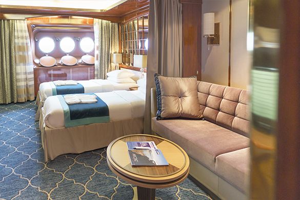Größe: 24 qm | Lage: auf dem Sportsdeck | Schlafbereich mit zwei Einzelbetten oder einem Queensize-Bett | Balkon | Badezimmer mit Dusche | Bademantel und Slipper | Pflegeprodukte und Fön | Großer oder begehbarer Kleiderschrank | Sitzecke mit Sofa | Minibar und Safe | TV und DVD-Player | Zugang für das Satellitentelefon